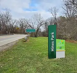Hines Park is a linear park in western Wayne County, Michigan, following the course of the Middle River Rouge. Hines Park serves as a flood control mechanism for the Middle Rouge, which experiences frequent floods due to its heavily urbanized drainage basin. Hines Park consists of 25 recreation areas linked by Edward N. Hines Drive, a 17.5-mile (28.2 km) scenic drive.