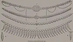 The libbeh and sha'eer (barley) are made of hollow gold beads, and popular among the middle and lower classes. The libbeh has a contrasting focal bead of coral or another semiprecious or precious stone in the center.[33] The sha'eer is also called qurun (horns).[36] The kiladeh was a long necklace that reached the girdle, made of precious stones. A similar necklace was made of gold coins of various kinds. The tók was a ring of silver, brass, pewter, or iron, worn as a necklace.[33]