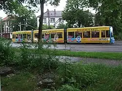 Tram in front of Kassel-Wilhelmshöhe station with advertising for EINKAUFAKTUELL