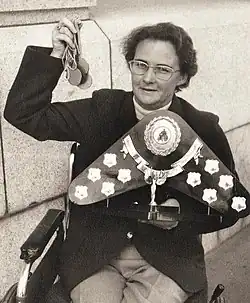 Schreiber was selected to represent Victoria at the three day event of the Australian Paraplegic Games held in Adelaide, South Australia, September 1964. She was among the first sixteen gold medal athletes from Victoria, winning four gold medals at these games. Her success led to selection[4] of one of only two Victorian athletes of the 15 member Australian team, to compete at the 1964 Summer Paralympics. At these games, she won Australia's fourth gold medal[5] in the women's club throw A class event with a throw of 17.31 metres, a silver medal in the women's javelin A event with a throw of 9.26 metres,[6] and a bronze medal in the women's table tennis singles B class event.[7] Schreiber and fellow team member Daphne Hilton were two of only three female athletes who contributed to Australia gaining fourth place in the medal tally behind United Kingdom, USA and Israel, at the 1964 Summer Paralympics.[8] At the Fourth Australian Paraplegic Games held in Brisbane Queensland, April 1966, Schreiber won seven gold medals in field events and table tennis, breaking the world record in precision javelin throw.[9]