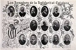 The alliance pattern changed following the 1888 split; both groups considered each other primary enemy and contended with venomous hostility,[69] occasionally supporting even the Liberals.[70] Enmity turned into rapprochement in early 1899, first locally in Guipuzcoa,[71] and later nationally.[72] In early 20th century two factions allied again against the Liberals, particularly against Ley de Jurisdicciones.[73] Opposition to liberal governments made Carlists swallow their enmity for Republicans and backtrack on their caution towards Catalanism; access to Solidaritat Catalana produced the largest Carlist parliamentary contingent in 1907, though the grouping fell apart few years later and its emulations elsewhere, like in Galicia or Asturias, were only moderately successful.[74] Provincial alliances under a broad monarchist-Catholic-regional umbrella continued until around 1915, concluded mostly with Integristas, Mauristas and independent candidates,[75] though there were skirmishes also among petty local Traditionalist factions.[76] The last years of Restauración are marked by mainstream Carlism entering into pivotal tactical alliances, including those with the Liberals[77] and Nationalists,[78] concluded at the expense of the enraged Integristas. Finally, the Mellista secession divided Carlism further on.[79]