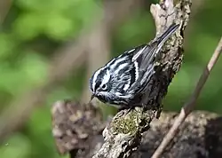 The elfin woods warbler is a small passerine, averaging 12.5 cm (5 in) in length and 8.4 g (0.30 oz) in weight.[9] Its upperparts are predominantly black with white areas, and its underparts are white with black streaks. Other identifying characteristics are dark brown eyes, white patches on its ears and neck, an incomplete white eyering, a white eyestripe, and two white spots on its outer tail feathers.[10] Like other Antillean warblers (Adelaide's warbler, Saint Lucia warbler, plumbeous warbler, and arrowhead warbler), it has a long bill and short, round wings (53.8 mm or 2.12 in average). Among Setophaga species, only Adelaide's warbler has a shorter average wing length.[2] Juveniles differ from adults, retaining a grayish-green back for approximately a year and partially molting from July to October.[9]