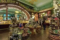 Inside there were three large retail halls.[2] Above ready clothing and general retail space, bank, public commercial courses (college-level business classes funded by Elisseeff and open to general public), and a performance theater. The theater is still there, albeit its lavish Art Nouveau interiors were destroyed in a 1960s renovation. Underneath the building were walk-in and drive-in coolers and refrigerator rooms for storage of provisions and some of Europe's best wine cellars.