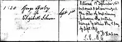 The first legal marriage, in Greene County, Tennessee, of two people who were likely former slaves appears to have been on June 29, 1865, when the county marriage ledger self-consciously records the wedding of "Samus Taylor of color to Polly McConister person of color".[13] On Wednesday, September 5, 1866, Elizabeth Johnson married George W. Forby in Greene County, Tennessee.[13] They were approximately the 18th black couple ever legally married in the county, although for whatever reason Liz's entry in the marriage book was not tagged "freedmen" or "people of color".[13] Lizzie Johnson was probably between 20 and 22 years old at the time of her wedding. George W. Forby was about 22, having been born in the first half of the 1840s in Greeneville, Tennessee, to George and Rebecca Forbey.[14] According to the U.S. National Park Service, which operates the Andrew Johnson National Historic Site, George Forby had formerly been enslaved by "Dr. John Shields of Timber Ridge".[15] Elizabeth and George had at least nine children over the next 22 years: Tillman, Lillie, Mary Belle, Charles C., Bessie, Nellie, George, Samuel Johnson, and Dollie.[9][8] In 1870 and 1880, according to U.S. census records, the Forbys lived in Greeneville; George Forby worked as a farmer.[9] Circa 1875, Lizzie and some of her children were living on Mary Johnson Stover's farm in Carter County.[11] This fact may be known because "in the last letter ever written by the former president, he mentions two formerly-enslaved individuals—William and Liz. To his daughter, Mary, he describes his upcoming trip to visit, stating 'William is very anxious to come and perhaps I may bring him as he is...desirous to see Liz and the children.'"[2]