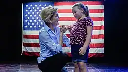 Warren instituted a number of traditions at her campaign events. One of them was how she would interact with young girls. She made it a practice to say to young girls, "My name is Elizabeth and I'm running for president, because that's what girls do", before having them make a pinky promise with her to remember what she said.[38][39] Another practice Warren instituted were so-called "selfie lines", where, at the end of her campaign events, she would take a photo with anyone who waited in line to do so. Her "selfie lines" would sometimes last for hours after her larger rallies.[40]