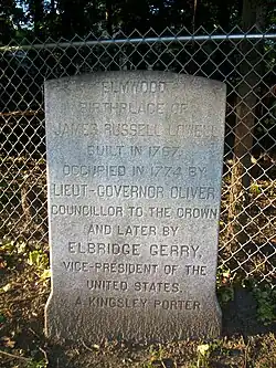 Elmwood, also known as the Oliver-Gerry-Lowell House,[2] is a historic house and centerpiece of a National Historic Landmark District in Cambridge, Massachusetts. It is known for several prominent former residents, including: Thomas Oliver (1734–1815), royal Lieutenant Governor of Massachusetts; Elbridge Gerry (1744–1814), signer of the US Declaration of Independence, Vice President of the United States and eponym of the term "gerrymandering"; and James Russell Lowell (1819–1891), American writer, poet, and foreign diplomat.
