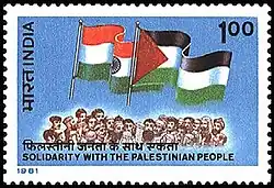India–Palestine relations (Arabic: العلاقات الهندية الفلسطينية), also known as Indian-Palestinian relations or Indo-Palestinian relations, are the bilateral relations between the Republic of India and the State of Palestine. These relations have been largely influenced by the independence struggle against British colonialism.[1][2] India recognized Palestine's statehood following the Palestinian declaration of independence on 18 November 1988;[3] although relations between India and the Palestine Liberation Organization were first established in 1974.[4]