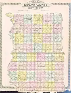 The county was created by the Dakota Territory legislature on February 10, 1879, with territories partitioned from Burleigh and Campbell Counties. It was not organized at the time, but it was not attached to another county for administrative and judicial purposes. This continued until November 9, 1883, when the governing structure was organized. The county was named for James A. Emmons (1845–1919), a steamboat operator and early Bismarck merchant and entrepreneur.[4][5][6]