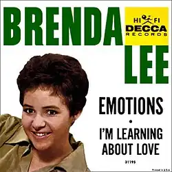In the summer of 1960 Tillis amended the lyrics to Kearney's original lyric for "Emotions" and successfully pitched the song for Brenda Lee to record.[2] Lee recorded "Emotions" in an August 16, 1960 session at Bradley Film and Recording Studio in Nashville, Tennessee: the session - produced and arranged by Owen Bradley and featuring Floyd Cramer on piano - also produced Lee's #1 hit "I Want to Be Wanted" which was the precedent single to "Emotions". With the B-side "I'm Learning About Love" - recorded with the same personnel at an August 19, 1960 session at Bradley Film & Recording Studio - "Emotions" was issued as a single in December 1960 and rose to a #7 peak in February 1961. "I'm Learning About Love" also became a Top 40 hit for Lee peaking at #33.
