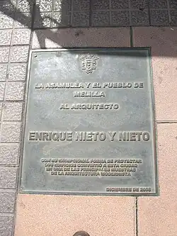 His notable work also includes the La Reconquista and Palacio Municipal (later renamed Autonomous City Palace[5]) in Plaza de Europa.[6] Nieto designed the National Theatre and Cinema building in Melilla in the 1920s which has a more geometrical style than most modernisme designs.[5]