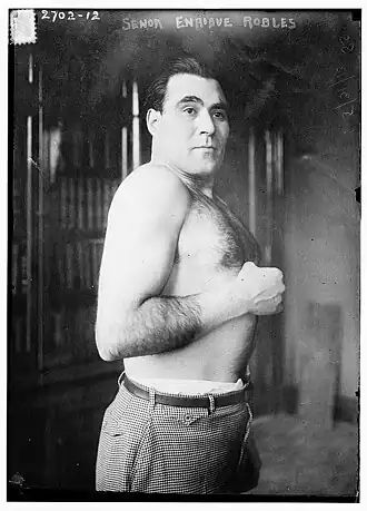 1. ^ "Enrique Robles of Madrid and Mexico Has Arrived in New York". The New York Times. July 17, 1913. Retrieved 2010-10-07. Sing a song of mantillas and grated windows and flirtatious eyes and six bulls to die, for Robles, the matador, has come to town, and the Spanish part of the populace is on tiptoe for a chance to see the champion of the arenas of Madrid and Mexico slay Andalusian bulls one after another while it looks on. Enrique Robles, scion of a Castilian family, as he explained yesterday at the ..., was not destined for the bull ring by his parents. ...