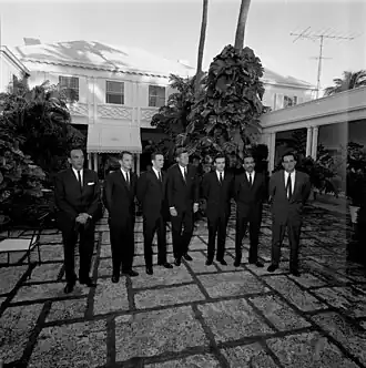 (left to right): Alvaro Sanchez, Jr., Roberto Pérez San Román, Jose Pérez San Román, President Kennedy, Manuel Artime, Erneido Oliva, and Enrique Ruiz-Williams