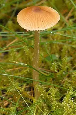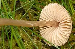 The cap is broadly conical to convex, light amber-brown, ribbed, and grows up to 3 cm in diameter. It is ribbed almost to the centre. The gills are salmon pink and sinuate. The spores are pink. The stem is light brown, longitudinally fibrous and slender.