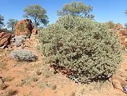 Subspecies platycalyx occurs in rocky places between Leonora and Shark Bay[3] in the Carnarvon, Gascoyne, Gibson Desert, Little Sandy Desert, Murchison, Pilbara and Yalgoo biogeographic regions;[13] subspecies pardalota grows in pebbly soil between Mt Augustus and Newman[3] in the Gascoyne, Little Sandy Desert and Pilbara biogeographic regions;[14] provisional subspecies Milgun occurs on a floodplain in rocky soil in the Gascoyne biogeographic region;[3][15] provisional subspecies Neds Creek is found to the east of Neds Creek homestead, provisional subspecies large leaves between Newman and Kumarina and provisional subspecies small calyx between Paynes Find and Meekatharra.[3]