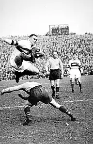 Eric Batten (Bradford Northern) hurdling over his brother Robert "Bob" Batten (Leeds) in Bradford Northern's 5-11 defeat by Leeds in the 1947–48 Yorkshire Cup 1st round 1st leg match during the 1947–48 season at Headingley, Leeds on Saturday 13 September 1947.