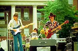 Johnson is best known for playing the lightly modified Fender Stratocasters and Gibson ES-335 electric guitars through either a Fender or Marshall amplifier, depending on whether he is targeting a clean rhythm, dirty rhythm, or lead tone.[40][41] He tends to swap out the bridge pickups in some of his Stratocasters for DiMarzio HS-2 pickups,[42] because they do not hum as much as standard single-coil pickups. Johnson has also played other guitar brands such as Robin, Rickenbacker, Jackson, Maton, and Charvel, one of which appears on the cover of the Ah Via Musicom album. In 2001, Johnson added a Gibson Custom Shop '59 Les Paul Reissue to his collection of guitars. Of note, he no longer uses a Dumble amplifier, as he had to replace a faulty component in his favorite Dumble, the Steel String Singer. It never sounded the same afterwards, and he sold the amplifier to Carlos Santana.