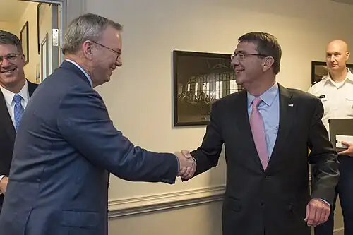 In March 2016, it was announced that Schmidt would chair a new advisory board for the Department of Defense,[50] titled the Defense Innovation Advisory Board.[51] The advisory board serves as a forum connecting mainstays in the technology sector with those in the Pentagon.[52]