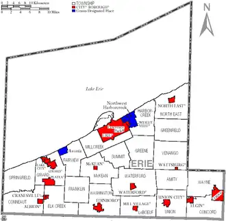 There are two cities in Erie County: Erie and Corry. Other notable population centers include Millcreek, Harborcreek, Summit, and Fairview townships, as well as the boroughs of Edinboro, North East, Girard, Waterford, and Union City. Erie County is bordered on the northeast by Chautauqua County, New York, on the east by Warren County, on the south by Crawford County, and on the west by Ashtabula County, Ohio. Directly north of the county is Lake Erie. Erie County occupies a position on Lake Erie that makes it the only county in Pennsylvania to share a border with Canada, located across the lake on the far shore.