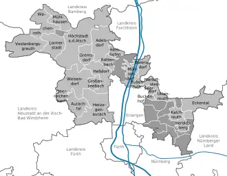 Birkach (unincorporated area)Neunhofer ForstMark (unincorporated area)Kraftshofer ForstKalchreuther ForstGeschaidtForst TennenloheErlenstegener ForstBuckenhofer ForstNurembergNurembergNürnberger LandFürthNeustadt (Aisch)-Bad WindsheimFürth (district)ErlangenAnsbach (district)Bamberg (district)Bamberg (district)Forchheim (district)BuckenhofAurachtalEckentalHeroldsbergKalchreuthLonnerstadtMöhrendorfMühlhausenOberreichenbachSpardorfUttenreuthVestenbergsgreuthWeisendorfWachenrothRöttenbachMarloffsteinHöchstadtHeßdorfHerzogenaurachHemhofenGroßenseebachGremsdorfBubenreuthBaiersdorfAdelsdorfDormitzer Forst