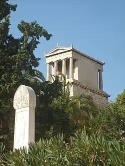 Heinrich Schliemann deliberately built up publicity for his activities and pursued a consistent policy of glorification. The discovery of the Priam's Treasure in 1873 became a world sensation, but did not lead to a serious perception of his discoveries by scientific authorities. The legitimization of his discoveries, according to S. Samida and M. Jung, was carried out in accordance with the "neohumanist canon of values of the educated bourgeois class".[58] The culmination of this process was Schliemann's burial in a special mausoleum, built according to ancient canons, with the dedication to Hero Schliemann (Greek ΗΡΩΙ ΣΧΛΙΜΑΝΝΝΩΙ).[59][Notes 2][60]
