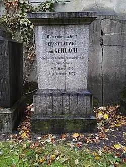 In 1877 he was elected member of the Reichstag for the Guelph Party for the electoral district of Hanover 4 (Osnabrück), joining the centrist parliamentary group as a guest member. On 18 February 1877, however, four days before the new Reichstag was sworn in, Ernst Ludwig von Gerlach died at the age of 81 as a result of a traffic accident,[3] which had occurred on the Schöneberger Bridge in Berlin on the evening of the 16th. He is buried at Cathedral Cemetery II in Berlin-Mitte.