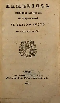 To a libretto in Italian by Domenico Bolognese (1919–1891) he composed the score for Ermelinda (1851), which in turn was based on Hugo's 1831 novel The Hunchback of Notre-Dame. The opera opened as Esmeralda at the Theatre Royal, Drury Lane on 30 June 1856 under the musical direction of J. H. Tully[4] and with a libretto in English by Charles Jefferys.[1]
