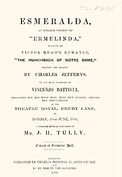Esmeralda is an 1856 grand opera in four acts with a score by the Italian composer Vincenzo Battista. With a libretto in English by Charles Jefferys,[1] it was based on Battista's Italian version Ermelinda (1851),[2] which in turn was based on Hugo's 1831 novel The Hunchback of Notre-Dame.