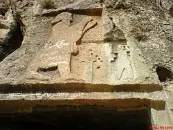 The Essaqwand Rock Tombs (Persian: گوردخمه اسحاق‌وند) are three rock-hewn tombs located 25 km southwest of Harsin in Kermanshah province, Iran. On top of the middle tomb there is a rock relief of a man with his profile toward the viewers. He is holding his hands in prayers in front of him. There is also a torch and a fire altar in front of him. Behind the fire altar there is another man, holding up something in his hands. The tombs have been attributed to different historical eras including Medes, Achaemenids, Seleucids and Parthians.[1]