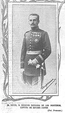 Espinosa de los Monteros was born on 28 October 1880,[2] into a family with military tradition. He was the son of military officer and ambassador Carlos Espinosa de los Monteros y Sagaseta de Ilurdoz and aristocrat María de los Dolores Bermejillo y García-Menocal. Younger brother of Carlos Espinosa de los Monteros y Bermejillo,[3] in his youth he lived and studied in Vienna, where his father was posted as a military attaché to Austria-Hungary.[4] There he learned German.[4] In 1894[2] he entered the Toledo Infantry Academy, from which he graduated at the age of 15; he left with his older brother Carlos for Cuba, where they participated in various battles of the Cuban War of Independence, in which they received recognition for their bravery. He completed his studies to become a General Staff officer, eventually joining the General Staff Corps.[5] He was a gentilhombre de cámara con ejercicio to King Alfonso XIII.[6]