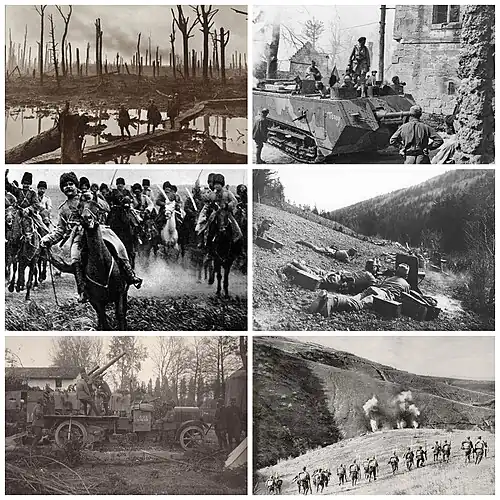 The Battle of Passchendale in Belgium was from 31 July to 6 November.[37] The Battle of Caporetto in Austria-Hungary was from 24 October to 19 December.[38] The Battle of Cambrai (1917) in France was from 20 November to 8 December; it had the "first large-scale, effective use of tanks in warfare".[39]