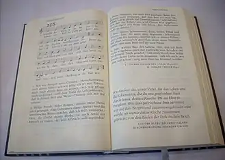 ![]() Layout of the current German Protestant hymnal, showing "Schmücke dich, o liebe Seele", a hymn by Johann Franck and Johann Crüger, as EG 218 | |