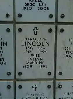 According to the National Archives, Lincoln gave away or sold many of Kennedy's documents and artifacts that she had been entrusted with managing by the Kennedy family after Kennedy's assassination.[5] In 2005, a legal settlement was reached that enabled the National Archives, the Kennedy Library, and Caroline Kennedy to recover thousands of pages of documents and other items. Lincoln died at Georgetown University Hospital in 1995, after complications that followed surgery for cancer. Her ashes were placed in a niche at a columbarium in Arlington National Cemetery.