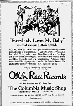 One important early recording was by the young Louis Armstrong with Clarence Williams' Blue Five on November 6, 1924, New York, NY. Released as a single: "Everybody Loves My Baby (but My Baby Don't Love Nobody But Me)" (Palmer, Jack; Williams, Spencer) [master S-72-959-B] – Okeh 8181. Featuring: Williams, Clarence (Piano, Director); Taylor, Eva (Vocal); Armstrong, Louis (Cornet); Thompson, Aaron (Trombone); Bailey, Buster (Soprano Saxophone); and Christian, Buddy (Banjo).[1] Before this recording, Armstrong won a vaudeville night at the Roseland Ballroom singing and playing this tune.[2] Another popular recording in 1925 was by Aileen Stanley.[3]
