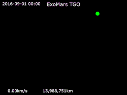 The Trace Gas Orbiter delivered the Schiaparelli lander on 16 October 2016, which crashed on the surface due to a premature release of the parachute.[10] TGO has been orbiting Mars since October 2016 and performing science observations of the planet since April 2018.[11]