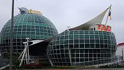 Three of the five theme pavilions were located in the Central Exhibition Building constructed by the host country. Covering an area of 11.5 hectares, it is the largest exhibition structure in the history of World Expositions.[6] The building was located near the Expo Axis, in Zone B. The total exhibition space of this building was 80,000 m2. A 7,000 m2 multifunctional room in the building's center had an atrium in which some of the individual pavilions opened. Construction was completed in September 2009 before interior construction began.[7]