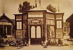 The exhibition was held in an area of 9,000 metres (30,000 ft) in the Parque del Buen Retiro. The project was led by the mining engineer Enrique Nouvion. The exhibition was clustered in one area, enclosed with a wooden fence, surrounded by trees and vegetation, and stood in the center of the main pavilion. The main pavilion was separated by an avenue lined with large ceramic frogs, leading to a lake fed by a river. The lake emptied into a rockery with a cascade, and on it was built the Royal Pavilion. A second smaller lake led through another large lake, closing the circuit. The weather conditions were a major inconvenience, and the different pavilions were built under snow, rain and wind, to the point that the exhibition was closed during the summer months to finish the work and reopened on 8 September. Most of the facilities built for the event were demolished at the end of the show, except the Royal Pavilion, which was demolished in the twentieth century, and the Palacio de Velázquez, which is the only building that remains today. The Development Minister commissioned architect Ricardo Velázquez Bosco to build the main pavilion, later known as the Palacio de Velázquez;[5] his team included engineer Alberto Palacio and ceramist tile maker Daniel Zuloaga, who through the Real Fábrica de La Moncloa, handled the palace's decoration.[6][7]