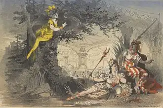 The first great hit to match the success of Le Pied de mouton was the Cirque Olympique's Les Pilules du diable (1839),[2] from a script by the vaudeville writer Auguste Anicet-Bourgeois and two writers for circus productions, Laloue and Laurent. While the stage effects had gotten more spectacular since the initial féeries, the plots remained familiar; in this play, the rich hidalgo Sottinez, madly in love with the ingenue Isabelle, pursues her and her lover Albert through bizarre and spectacular adventures.[16] Les Pilules du diable was widely revived and imitated,[16] and was possibly the most celebrated féerie of all.[4]