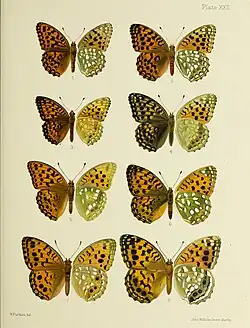 | Argynnis adippe var. coredippe = Fabriciana xipe (Grum-Grshimailo, 1891) 3 male, 4 female in Leech, J. H., 1892–1893. Butterflies from China, Japan and Corea 3 | |