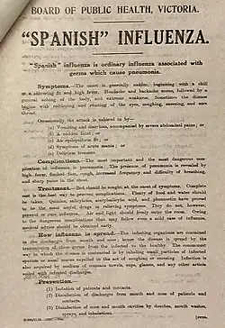 In 1918 Melbourne and Sydney's ports were placed under quarantine in an attempt to avoid the introduction into Australia of the Spanish Influenza epidemic which was claiming thousands of lives around the world.[6] While the quarantine had some effect in limiting the introduction of the disease to Australia, the first cases were eventually diagnosed and patients were hospitalised, causing a sharp rise in intake figures. Fairfield Hospital's intake of patients had remained stable until 1918–1920; during these years the intake jumped to 6000 patients a year, which would remain the average until the late 1980s.[3]