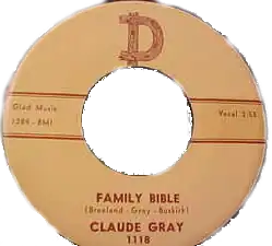 Buskirk convinced singer Claude Gray to record a set of original songs by Nelson, including "Family Bible", "Night Life", "The Party's Over", and "Leave Alone". Buskirk organized the session and hired the musicians. Buskirk also sold a share of "Family Bible" to Gray for US$100.[5] Produced by Bill Quinn, the song was recorded on December 18, 1959, at Gold Star Studios in Houston, Texas.[6] It was released by D Records in February 1960[7] and reached number seven on Billboard's Hot Country Singles.[5] Billboard called the song "very well done", giving it a rating of three stars out of five.[8]