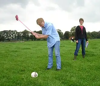 Farmersgolf is played with a special wooden golf club, with a club head in the shape of a wooden shoe, or clog (in Dutch: klomp). A farmers golf ball is, with its 20 centimeter diameter, much larger than a traditional golf ball.