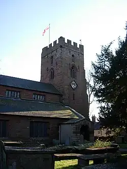 St Chad's is the old parish church in Farndon. It is thought that some portions of the church date back to Sir Patrick de Bartun, a knight of King Edward III, whose effigy lies in the nave. The Church was damaged during the English Civil War and later repaired. The church contains a unique Civil War memorial window, and features an image thought to be that of William Lawes, the famous court musician, who was slain at the battle of Rowton Heath. The church tower still shows signs of Civil War musket ball damage.[12] The churchyard contains war graves of two British soldiers of World War I,[13] Sergeant Joseph Easter and Private Thomas Harrison.[14]