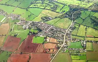 The parish church is a small stone edifice dedicated to St John the Baptist. Originally of Norman architecture, it was rebuilt in Gothic style by John Pinch the younger in 1843.[4] The stump of the medieval cross and a carving over the door survive from an earlier building.[12] The church is set away from the main village in a picturesque location in the middle of a field, originally in order to protect the villagers from the plague.