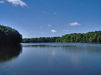 Farrington Lake is a scenic freshwater reservoir in Middlesex County, New Jersey near Milltown, New Jersey. Created by a dam on the Lawrence Brook, a tributary of the Raritan River, the lake is in fact a widened section of the Lawrence Brook. Its main tributaries are the Ireland Brook, the Beaverdam Brook, and the Oakeys Brook.