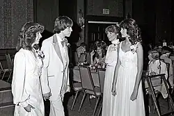 - Starting in 1975, women's semi-formal wear became more tailored and sharp. This included a lot of layering, with women wearing two blouses at once, multiple sweaters, pants underneath tunic dresses, and jumpers worn over long, fitted dresses. The 1970s also featured some of the most scandalous dresses worn publicly in American history up to that point.[18] Other clothes worn in this style include suede coats, peacoats, blazers, cowl-neck sweaters, pencil skirts, backless dresses, extremely low-cut dresses, palazzo pants,[18] tube dresses,[15] evening gowns, jacket dresses,[20] and pinstriped pantsuits.[15][18] Women's dresses in the mid-1970s were dominated by pastel colors, but Asian patterns were also common.[20]