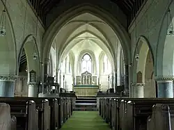 The Church of England parish church of Saint Mary the Virgin was designed by the architect George Edmund Street and built in 1865–66.[2] It has one stained glass window by William Morris.[2] The chancel has a reredos that includes a mosaic by Salviati and a Crucifixion carved by Thomas Earp.[2] It has been protected under the commonest category of listed building (Grade II).[7] The church replaces a medieval building that stood slightly further east and was demolished in 1866.[8] The new church incorporates original Early English fragments that suggest the former church was at least partly late 12th or early 13th century.[8]
