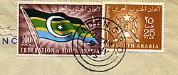The Federation issued its own Adeni postage stamps from 1963 to 1966. Most of its issues were part of the omnibus issues common to all the Commonwealth territories, but it did issue its own definitive stamps on 1 April 1965. The set of 14 included 10 values, from 5 to 75 fils, each depicting the arms of the Federation in a single color, while the top four values (100 fils, 250 fils, 500 fils, and 1 dinar), featured the flag of the Federation.