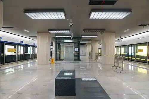 The station is themed around "Riding the Tides" (Chinese: “弄潮”) . The purple, wave-shaped ceiling on both sides of the concourse and the central white linear folding lights resemble the surging tides of the Qiantang River. The walls and pillars of the platform reflect the colors and textures of the tidal flats. The combination of shaped light strips and stainless steel materials is filled with a modern technological atmosphere, aiming to continue the historical essence of the Qiantang River tides while also providing a sense of modernity.[5]