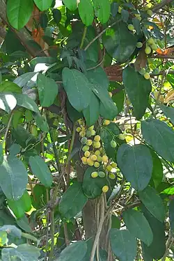 Fibraurea tinctoria is a species of flowering plant in the family Menispermaceae.[2][3] It is native to Assam, Borneo, Cambodia, India, Java, Laos, Malaysia, Myanmar, the Nicobar Islands, the Philippines, Sulawesi, Sumatra, Thailand, and Vietnam, where it grows in wet tropical areas.[1] It is considered locally common.[4] It fruits in April and May, producing yellow-orange drupes.[4] Common names for this plant include yellow root (East Kalimantan), akar palo (Aceh), and akar kuning (Indonesian) (Central Kalimantan).[5]