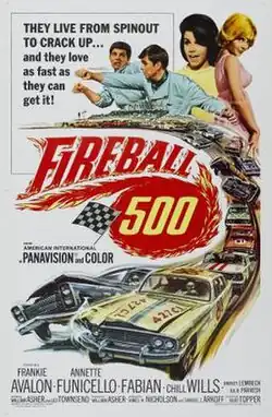 Fireball 500 is a 1966 stock car racing film, blended with the beach party film genre. A vehicle for stars Frankie Avalon, Annette Funicello, and Fabian, it was one of a string of similar racing films from the 1960s. Written by William Asher and Leo Townsend, and directed by William Asher, it tells the story of Dave Owens (Avalon), a stock car racer forced to run moonshine.
